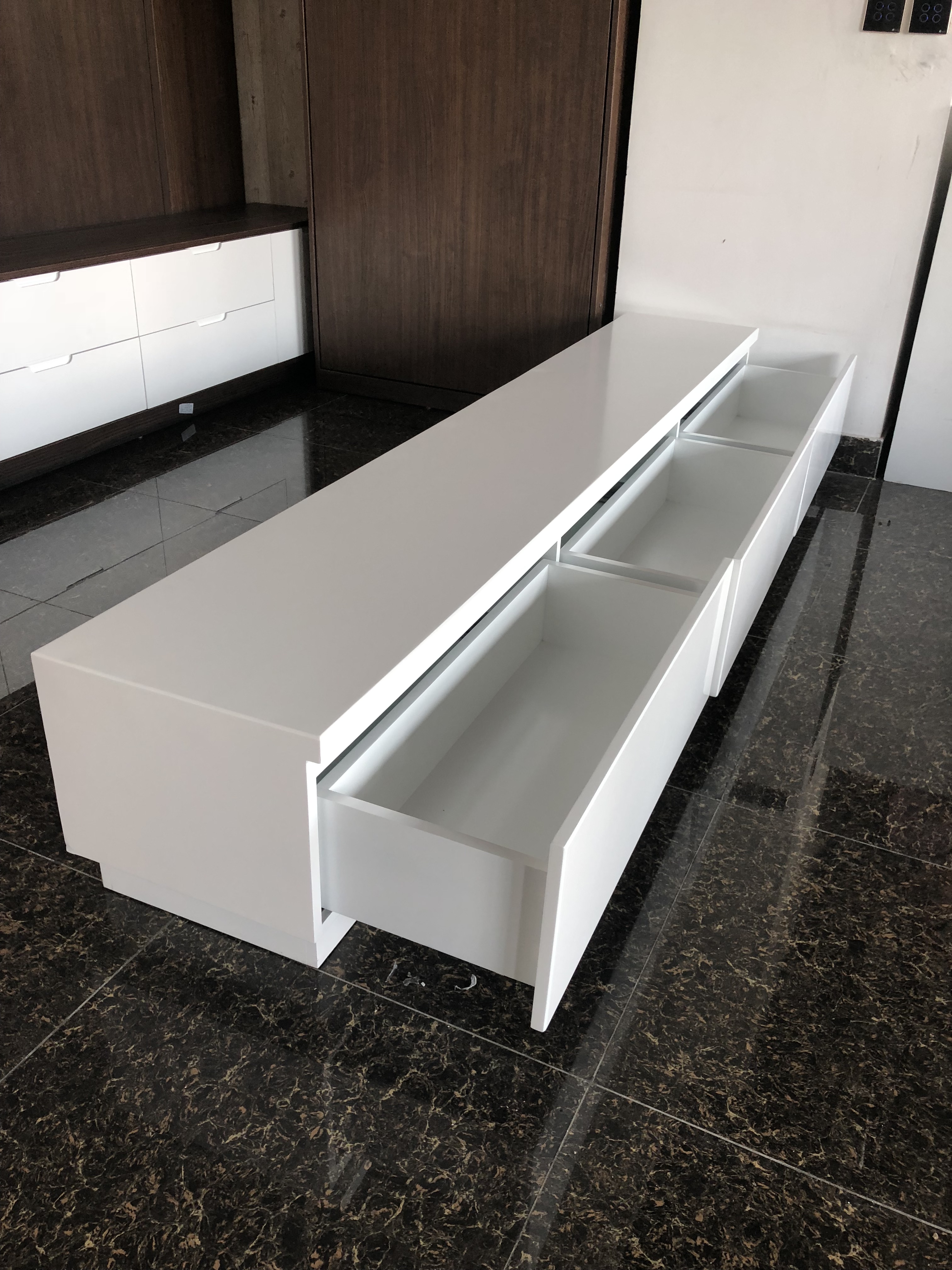 Kệ tivi 3 ngăn KTV-01 được làm từ gỗ công nghiệp MDF chống ẩm phun sơn. Kích thước rộng 40 cm, dài 2m4.