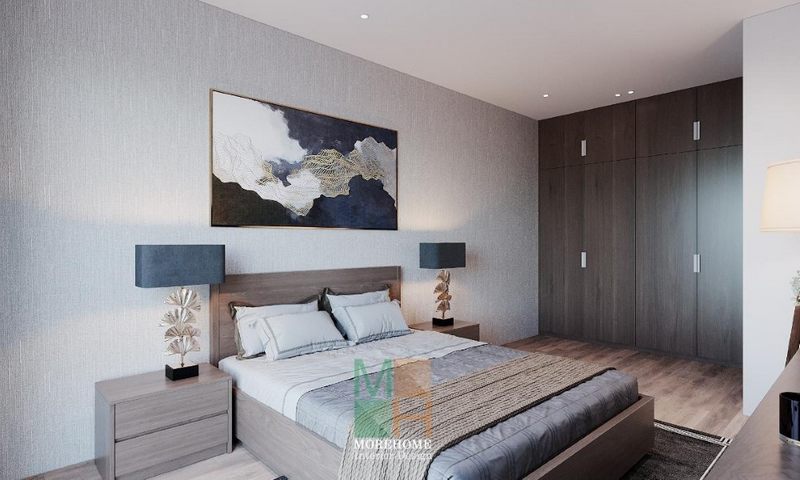 Mẫu phòng ngủ hiện đại trong các căn hộ sử dụng giường gỗ công nghiệp có độ đẹp và bền cao.