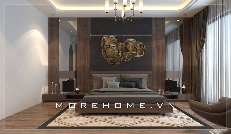 Giường ngủ hiện đại trong căn hộ đầy ấn tượng, với tone màu nâu cánh gián làm chủ đạo cùng với nội thất khác tạo nên sự liên mạch trong không gian nghỉ ngơi.
