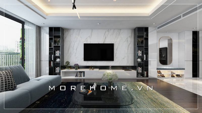 . Không gian phòng khách của căn hộ cao cấp được thiết kế với kệ ti vi treo tường và bức tường ốp đá vân mây màu trắng, tạo nên sự sang trọng và đặc biệt hơn nữa là điểm nhấn nổi bật cho không gian.